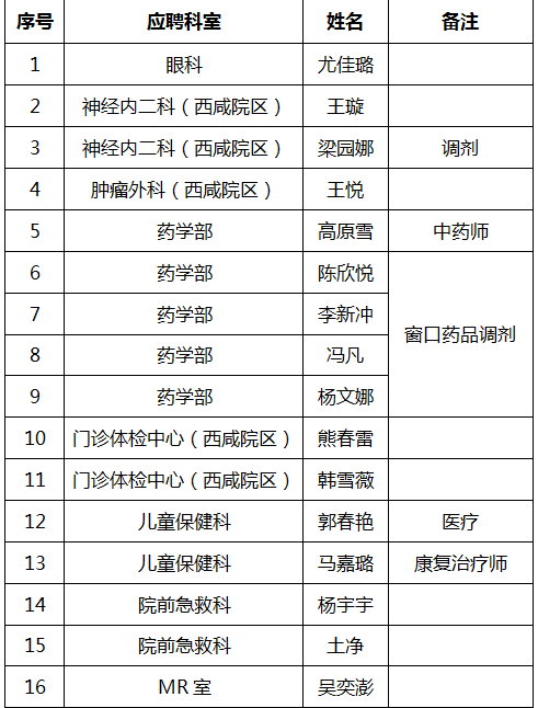 根据21点技巧中心 《关于招聘合同制临床医技类岗位工作人员公告》,在纪检监察处的全程监督下,经岗位公布、报名登记、资格初审、笔试、面试等程序,拟聘用尤佳璐等33人到21点技巧中心 工作,现将结果予以公示。