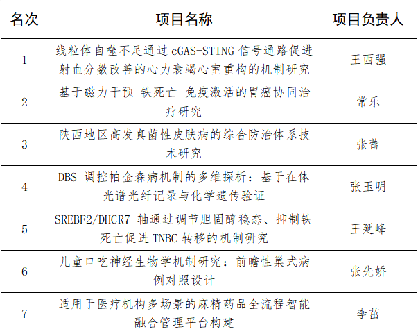 根据陕西省卫健委申报计划的要求,截止2025年4月21日,科研处共收到参与评选的项目34项,通过形式审查的项目为34项。经过专家评审组认真详细的答辩评审,根据要求,拟推荐上报陕西省卫健委7项。现对评审结果进行公示,公示期:4月22日至4月26日,欢迎大家监督。