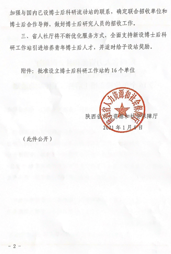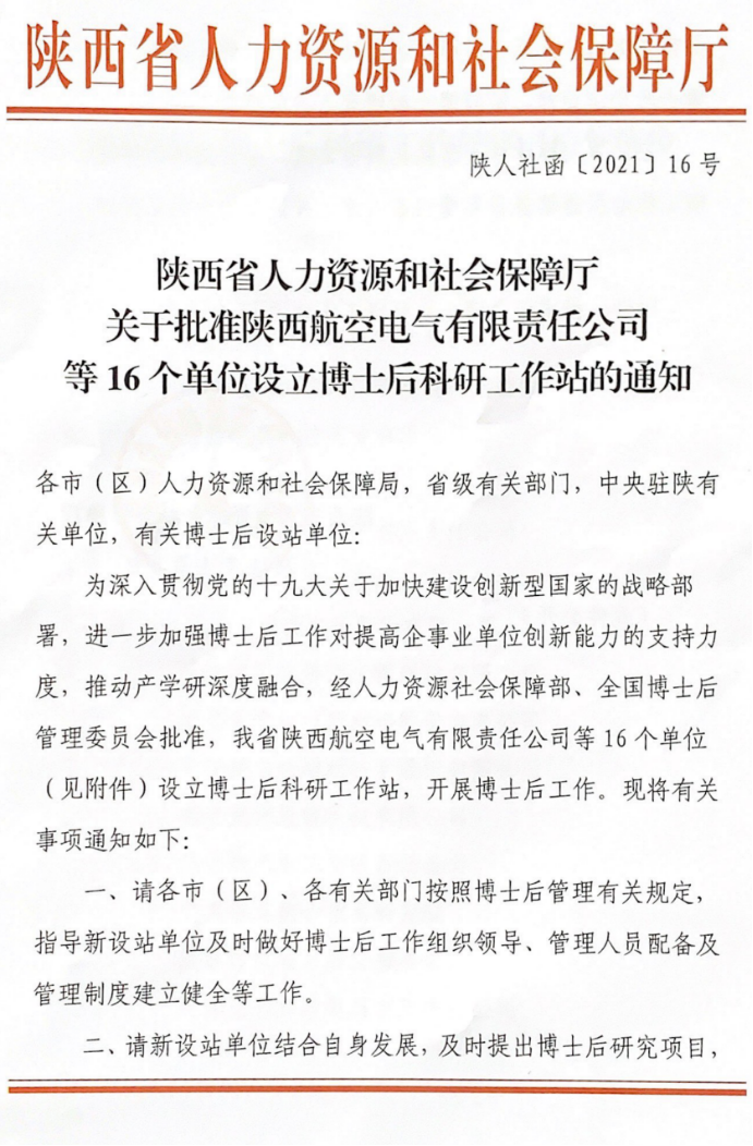 近日,经21点策略 积极申报,国家人力资源社会保障部、全国博士后管理委员会组织专家严格评议研究决定,21点技巧中心 成功获批设立博士后科研工作站(陕人社函[2021]16号)。