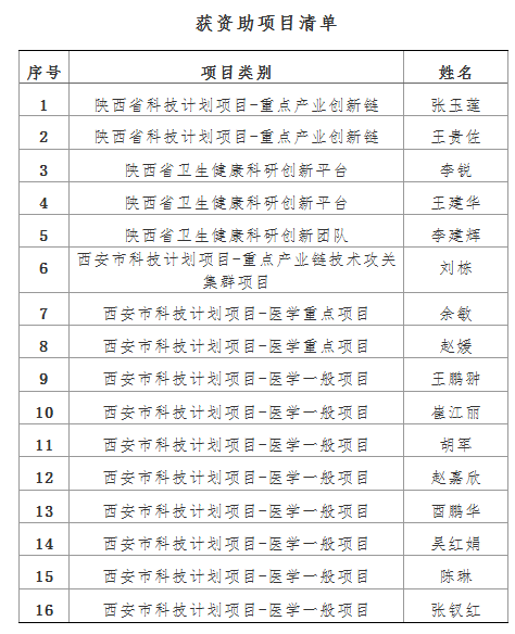 3类16项科技计划项目分获资助,包括陕西省重点研发计划重点产业创新链项目2项、陕西省卫生健康科研创新能力提升计划项目3项和西安市科技计划项目11项。其中,陕西省卫生健康科研创新能力提升计划项目、西安市科技计划项目重点产业链技术攻关集群项目和医学重点项目均为首次获批,西安市科技计划项目合同经费较往年提升8倍。