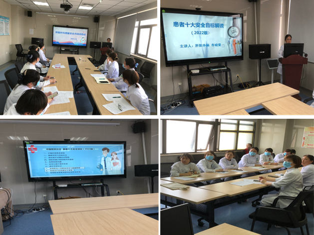 为适应新形势下患者健康服务新需求,加强护理质量和风险防控管理,不断强化专科护理水平提升,促进护理工作高质量发展,4月6日,肝胆外科利用班后时间,开展护理质量安全月活动,组织全体护理人员学习“患者十大安全目标”,营造安全文化、安全责任,安全担当良好氛围。仵晓荣护士长结合临床案例,全面解读了2022版患者十大安全目标。全科护士结合临床工作实际问题进行了讨论,高年资护士分享了工作经验。