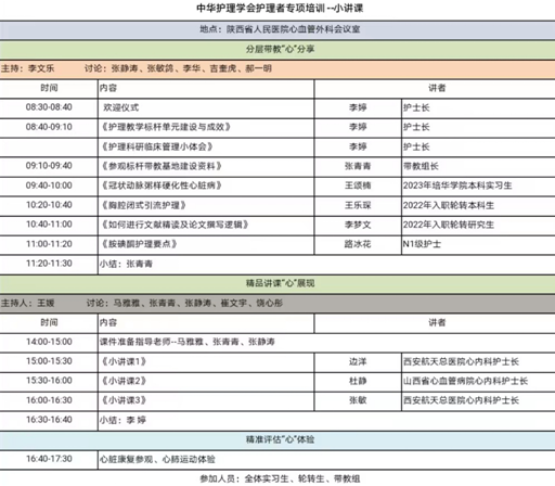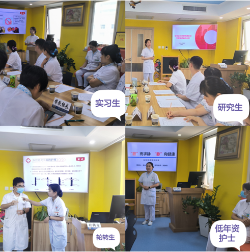 迎来2023年3名中华护理学会护理管理者专项培训班学员前来实践,标杆带教科室心血管外科负责专项培训小讲课。8月24日,在李婷护士长组织下,专题培训小讲课及分享活动顺利进行。带教组秘书李文乐、心外监护室带教组长王媛分别主持。