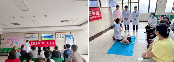 危重症小组组织患者及家属开展了以“重启生命,救在身边”主题活动,讲解并演示了心肺复苏和(AED)的实用技术及操作方法,进行了从意识判断到心肺复苏以及AED使用整个急救过程现场还原。