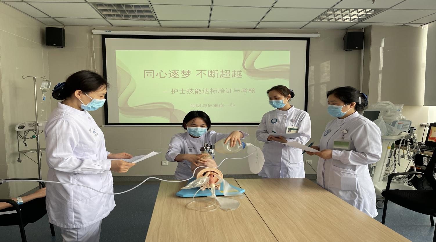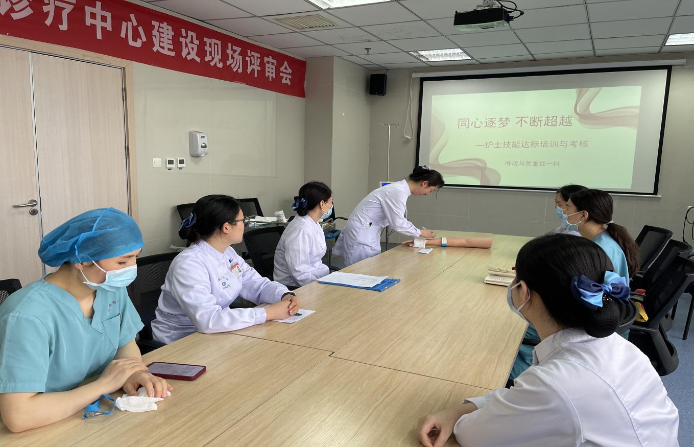 李英护士长提出目标要求,强调要人人高度重视、严格考核,最终全员达标。本次培训项目包括吸痰、动脉采血、静脉留置针穿刺及微量泵、无创呼吸机、简易呼吸器的使用,由技能组长赵璐负责培训指导。现场气氛非常活跃,大家刻苦练习,强化护理技能,确保顺利通过。