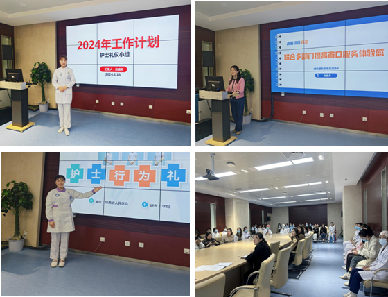培训会上,肖培芬副护士长解读了2024年礼仪小组年度计划,鼓励大家积极参与小组活动,各科室礼仪教员以点带面,带动科室护士规范基础礼仪,树立21点策略 形象,打造护理服务品牌。随后,礼仪小组副组长刘晏兵副护士长做2024年质量改善项目启动工作动员,从项目选题背景、主题选定、人员分工、活动计划拟定四个方面进行了汇报。礼仪小组副组长李阳副护士长做《护士行为礼仪》授课,从护士的仪容仪表、仪态举止、常用工作礼仪规范,如站姿、坐姿、走姿、蹲姿、远近距离指引、接打电话等进行了培训指导。