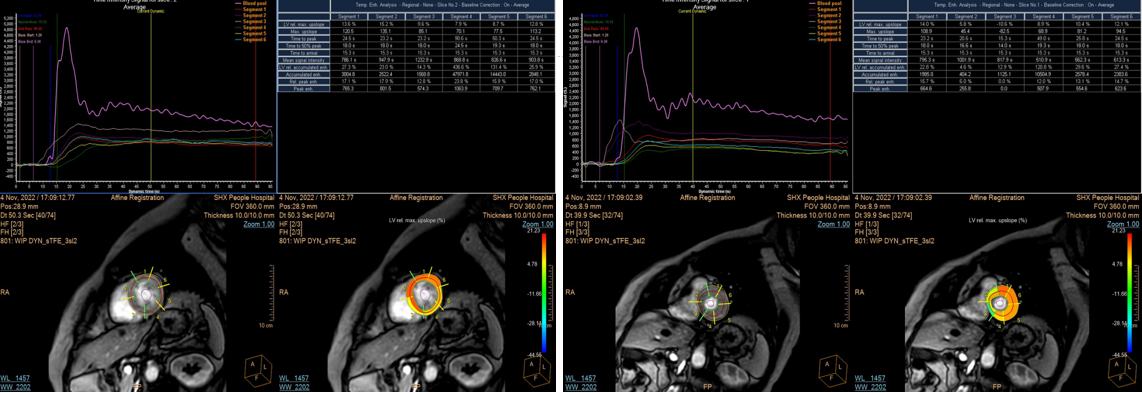 MRI负荷心肌灌注检查增加了心肌微循环障碍患者的检出率,同时通过后处理软件对微循环障碍可进行定量及半定量分析(图2)。因此负荷心肌灌注可应用于冠状动脉交界性狭窄患者、冠状动脉狭窄<50%的患者以及非缺血性心肌病患者,评估其是否存在微循环障碍,是目前检出心肌微循环障碍的可靠且无创的检查方法,为心内科医生对这类患者采取个性化治疗方案提供客观依据,并可进行疗效评价。