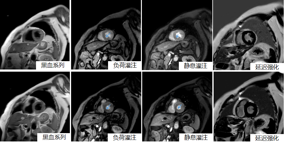 患者为70岁老年女性,间断胸闷、胸痛20年,高血压10年,入院后行冠状动脉CTA示前降支近、中段管壁局灶性钙斑,管腔轻微狭窄。为进一步寻找确切原因,姜馨主任医师与磁共振室雷晓燕副主任沟通后,决定应用瑞加诺生注射液对其进行MRI负荷心肌灌注检查。雷晓燕副主任高度重视,精心组织,张鑫技师长和李剑锋技师、李娟护士长从检查前患者注意事项、抢救车与急救药品、制定扫描方案、预演检查流程等方面做充分的准备,事无巨细,确保检查能够顺利完成。