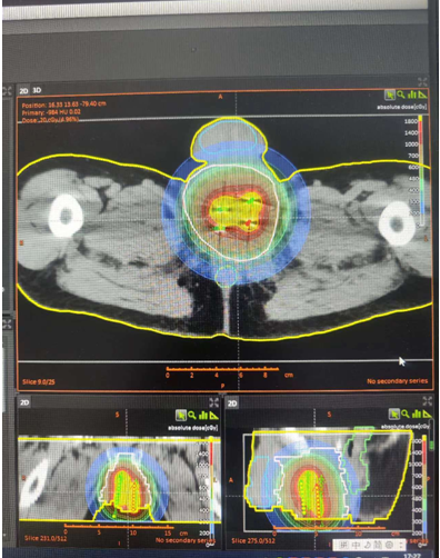 确定CT引导插植穿刺路径后,王青主任医师、陈鑫主治医师及肿瘤内科雷雨副主任医师、陈红蕾护士、张高飞物理师、李宇物理师、刘国强物理师等共同探讨、开拓创新,物理师、技师、护师团队密切配合,于7月21日及26日,连续两次为患者实施高难度后装近距离插植治疗。术前基于该患者CT图像制定插植计划,手术过程非常顺利,20分钟内完成了4根插植针的置入,术前术后放疗计划吻合,单次给予患者高放疗剂量,肿瘤有效边界治疗区域可达到10Gy,达到精准近距离治疗的目的。