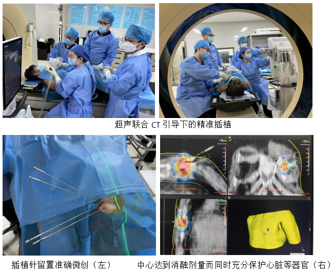 患者在它院进行乳腺癌治疗后,胸壁出现复发,肿瘤位置较深,内侧侵犯胸骨,深部蔓延至距心包仅5mm。患者伴有明显骨痛。在给予CDK4/6抑制剂联合内分泌治疗的同时,决定进行局部插植放疗。由肿瘤外科祝旭龙副主任医师,谭苗、申艳伟主治医师,放疗科陈鑫主治医师、张高飞物理师、陈红蕾护士组成的多学科团队,完成了超声联合CT引导下的微创介入插植放疗。