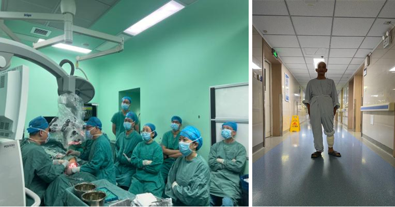 技术水平的信赖,患者及家属决定实施科室的手术方案。慕生枝主任高度重视,因为显微外科手术不仅要在术前有严格的评判,而且术后管理也尤为重要。进一步明确患者的全身情况及血管条件,排除手术禁忌症,给予行游离背阔肌瓣+自体皮移植术。术前与患者及亲属进行充分沟通,将术中风险、围手术期注意事项充分告知。慕生枝主任全盘部署,主刀医生为郭亚东副主任医师和李建武主治医师。术中将两处临近肿瘤彻底扩大切除,形成约10x14cm大小的缺损,并有部分胫骨外露。在游离受区血管时,因患者年龄较大,动脉及静脉血管较脆弱,多次出现破裂。背阔肌肌瓣切除顺利,在游离穿支血管时,保护好临近血管神经,尽可能保护供区的感觉及运动功能。李建武主治医师在吻合血管时,因血管壁脆弱,缝合过程中多次出现血管撕裂,将血管远端修剪,血管蒂长度已很难满足血管断端的端侧吻合,几经改变手术方案,考虑行胸背动脉与胫后动脉的端端吻合,但这样使患者会失去一支供养下肢远端的动脉。李建武主治医生沉着冷静,坚持实行端侧吻合,虽然延长了手术时间,但获得了很好的效果。术中王国栋主治医师、张松医师、刘霄医师及烧伤整形医学美容外科的规培和进修医生全程配合,麻醉医生术中实时调整患者血压,满足吻合条件。手术护士配合默契,手术顺利完成。学科护理团队对游离皮瓣移植术后患者个体化护理,严密检测生命体征,密切观察皮瓣颜色、温度、有无肿胀和毛细血管反流情况。术后皮瓣恢复良好,左下肢未见肿胀麻木等表现,皮瓣供区愈合良好,无感染征象。经过20余天的住院,患者已痊愈,可下地活动。