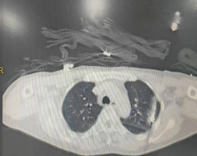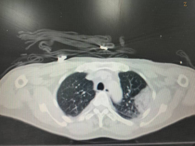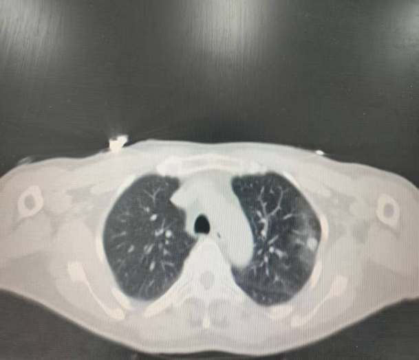 患者为中年男性,曾接受肾盂癌根治手术,术后因肿瘤复发开始免疫治疗。治疗期间,患者肺部出现孤立性转移病灶缓慢增大(寡进展)。经多学科讨论,肿瘤内科决定采用冷热多模态消融技术对肺部转移病灶进行处理。术中根据规划路径,在CT引导下将消融针经皮穿刺至病灶位置;行2个冻融循环,复查消融范围超出病灶边界5mm;复温状态下逐步拔出穿刺针。整个手术耗时约1小时,术中患者无疼痛刺激及咯血,术后无气胸。术后第二天顺利出院。