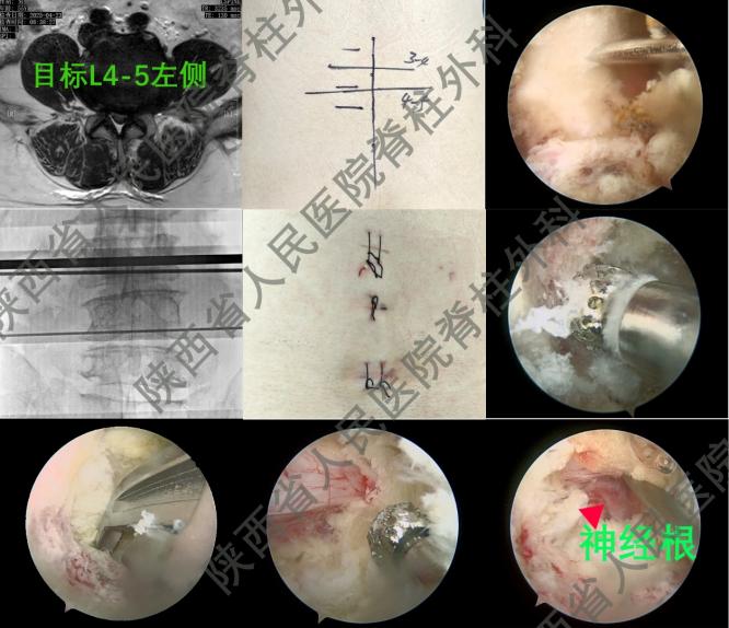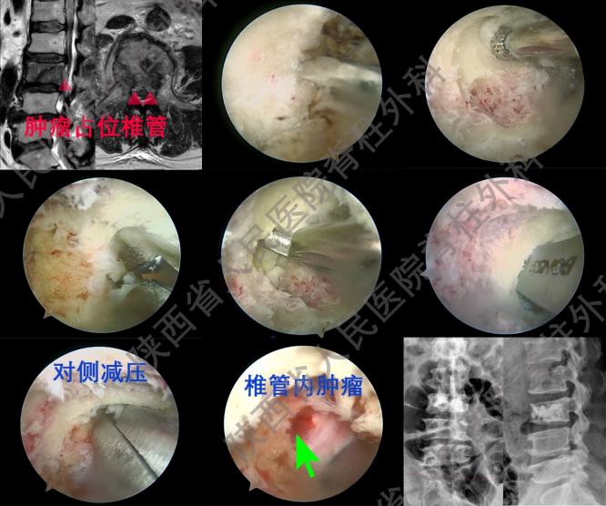 陕西省UBE技术联盟的技术优势,确保手术实施的可行性。术前,陈明副主任医师和李智斌主任医师进行了精心准备。5月14日,在麻醉科的全力支持下,西咸院区骨科团队孙正明主任医师、武世勋主治医师共同为患者顺利进行了手术。手术通过建立腰4-5间隙UBE通道在内镜下首先完成腰4-5椎管减压神经松解术,然后再建立腰3-4间隙UBE通道进行腰3椎管内肿瘤切除椎管减压,最后在内镜监视下完成腰3椎体强化术,避免骨水泥渗漏。手术共4小时,术后患者疼痛及麻木症状明显缓解。