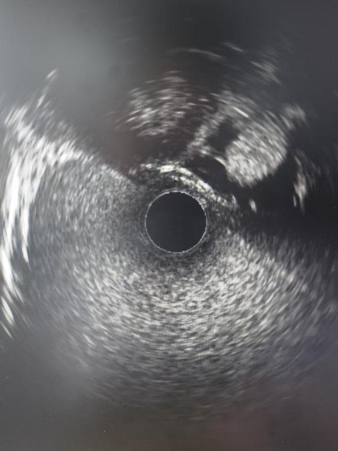 神经内二科团队分析讨论后,为患者实施了静脉窦造影术+测压+血管内超声检查。造影提示右侧横-乙状窦交界区局限性狭窄,测压提示狭窄近-远端压力差3 mmHg,血管内超声探及静脉窦内多个类圆形凸起,提示内源性狭窄,考虑蛛网膜颗粒所致局限性狭窄。
