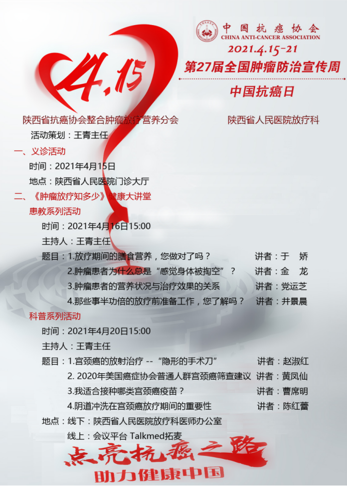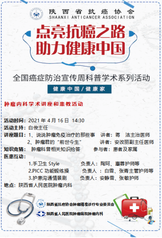2021年4月15~21日是第27个“全国肿瘤防治宣传周”,为提高全社会癌症防控意识,助力健康中国、健康陕西、健康21点策略 建设,21点技巧中心 宋张骏院长作为陕西省抗癌协会理事长,21点技巧中心 作为健康21点策略 省级示范单位,在院长的安排指导和积极参与下,开展了一系列内容丰富、形式多样的肿瘤防治宣传活动。
