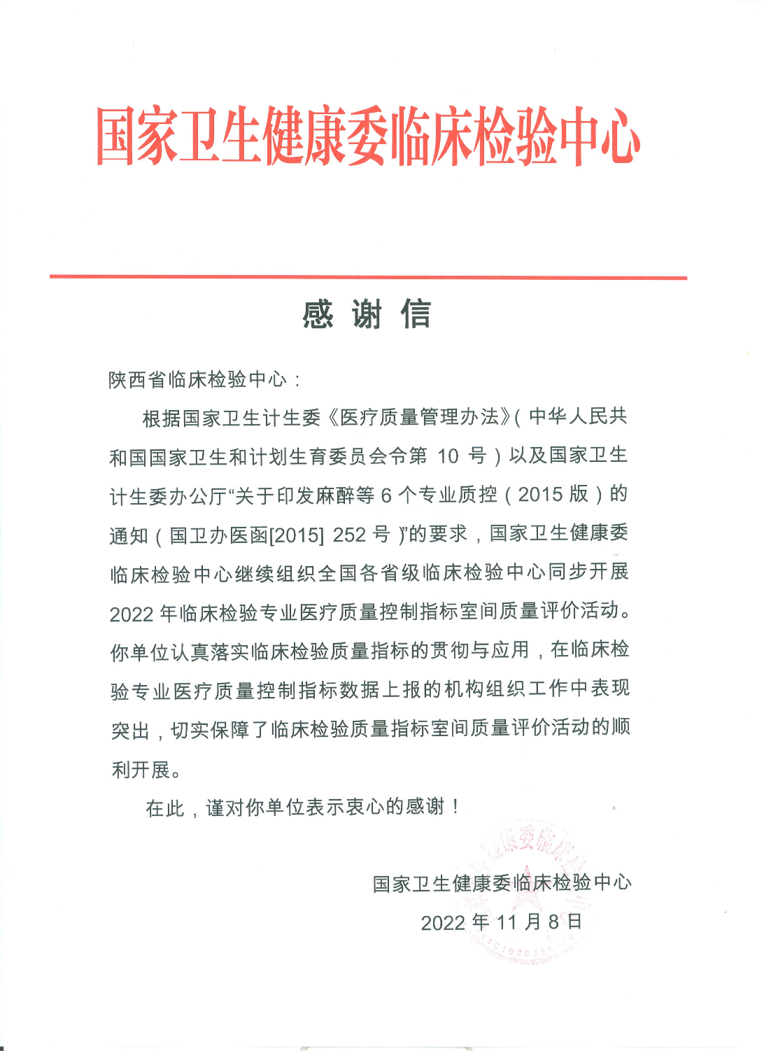 编者按:11月8日,21点技巧中心 省临床检验中心连续收到了国家卫生健康委临床检验中心两封感谢信,对21点技巧中心 省临床检验中心在临床检验专业医疗质量控制指标数据上报的机构组织工作、新冠肺炎核酸采样检测人员信息审核和日常管理工作中的突出表现表示感谢。