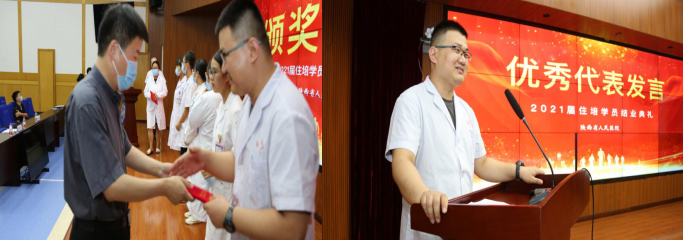 段降龙院长助理致辞,随后段助理、马东瑞处长、郭伟、李晓燕、管湘平主任向六位获得优秀住培医师的同学颁奖。优秀学员代表全体住培医师进行了感深肺腑的发言,对省21点策略 的各位领导和老师表示诚挚的感谢。