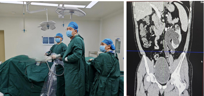 患者以急性左侧腹部疼痛入院,行B超检查提示左侧输尿管末端0.7X0.5cm结石,给予对症处理后一般症状较前明显缓解。复查CT检查提示左侧输尿管上段走形迂曲,左肾及左侧输尿管全程积水。经移植泌尿外科李智斌主任、阮东丽副主任医师精心评估和研究手术方案,决定行完全微创手术治疗,团队针对后续可能出现情况做好了充分的准备和安排。手术过程中,在李智斌主任医师带领下,手术全程通过腹腔镜进行,术后患者安全返回病房。