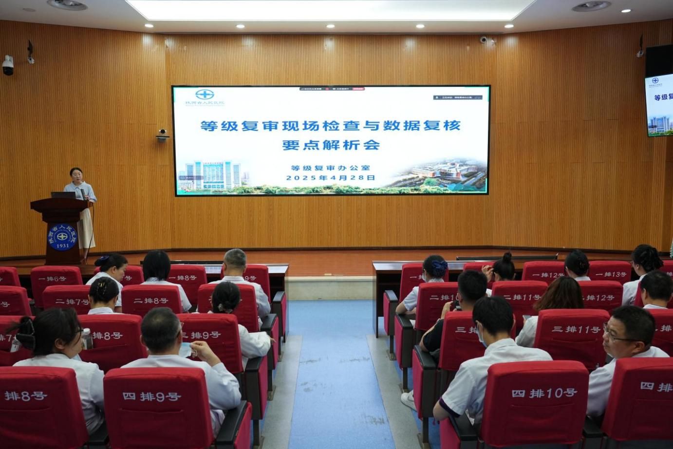 组织开展了等级复审现场检查与数据复核要点解析专题培训。两院区临床医技科室负责人、护士长、业务副主任、等级复审联络员及数据填报员200余人参会。