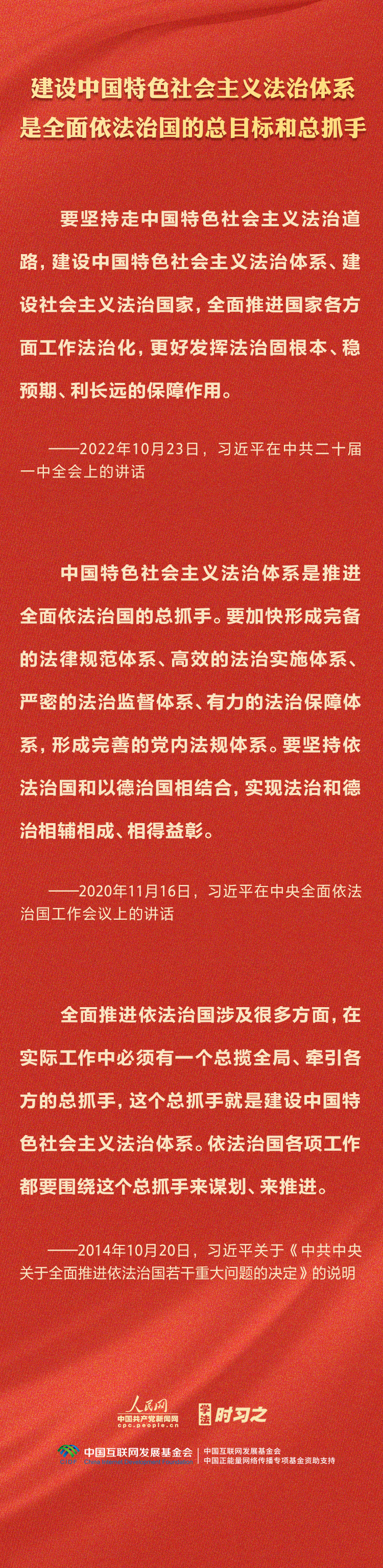 今年是贯彻落实党的二十大精神的开局之年。中共中央政治局决定从今年4月开始,在全党自上而下开展学习贯彻习近平新时代中国特色社会主义思想主题教育。习近平法治思想是习近平新时代中国特色社会主义思想的重要组成部分,人民网·中国共产党新闻网推出学法时习之·学习习近平法治思想系列策划,本篇聚焦“坚持建设中国特色社会主义法治体系”。